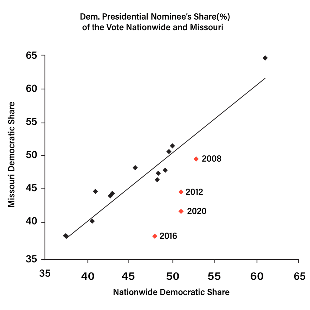 In 2008, 39% of Missouri voters self-identified as evangelicals. Just 29% of them went for Obama. That was easily the difference between him winning and losing the state. That bloc then helped overwhelm successive Democratic tickets in 2016 and 2020, supporting Trump at a massive clip both times.