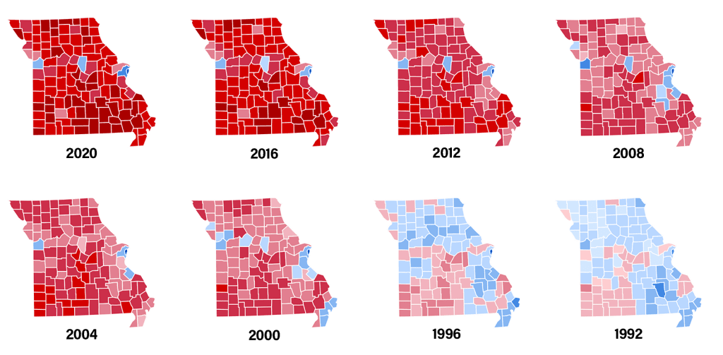 Geographically, Missouri mirrors the country in a few ways. It’s predominantly rural, bracketed by dual population centers on its eastern and western borders. St. Louis and Kansas City are its “coasts.” Those two cities vote reliably blue and nearly always have, as do most comparable cities nationwide. Almost everything in the less densely populated middle now votes reliably red; again, true of much of the country today.